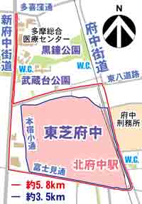 JUGEMテーマ:ジョギング 府中市は何か大きい施設が多く、外周ジョグコースが設定しやすいと以前に書きました。 北府中駅付近としては東側、府中刑務所や東京農工大学の周辺の歩道を利用しましたね。 今回は駅前と西側を走ってみましょう。 ジョギング紹介ページ総合は以下のリンク先へ ( RUNTOP → 東京多摩 府中市 ) 北府中の西側と言うと東芝府中がありますね。 この広い敷地周辺を利用したコースが『東芝府中周辺と新府中街道の坂コース』として市のHPにも...