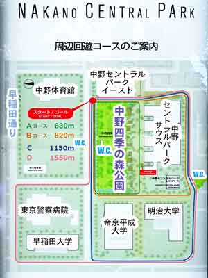 JUGEMテーマ:ジョギング 中野セントラルパーク、続きでCとDコースを紹介。 前回のA、Bコースより更に大きく回ります。 現地の案内板には無いのですが、ルートはこう。 A,Bコースの200m地点から分岐ですね。 まずはCコースで歩道をそのまま直進します。 300m地点 帝京平成大学脇 まだ真っ直ぐ。 道にぶつかった角で400m地点。 (道を越えた正面には「高円寺北一みどり公園」が見えます) この角を左に曲がりましょう。 ...
