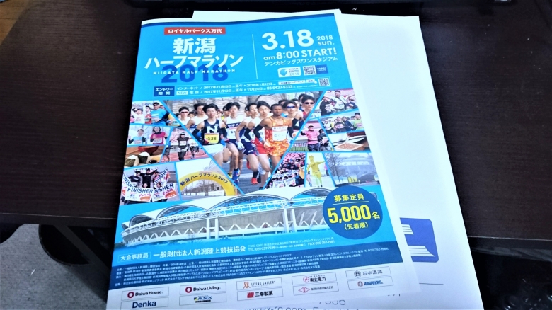 JUGEMテーマ:ジョギング 本日帰宅すると見慣れない大きな封筒が・・・?早速開けてみたら新潟ハーフ2018の案内パンフ。すっかり忘れていました。 早いもんです。もう来週月曜日エントリー開始。で、早速色々見てみたら結構前年から変わってます。目についた所では・・・、 ?募集定員:(昨年)4,000名→(今年)5、000名 (゜◇゜)「ワオ〜、千人UP!」 ?制限時間:(昨年)4時間→(今年)3時間 (>_<)「1時間減。ちょっ...