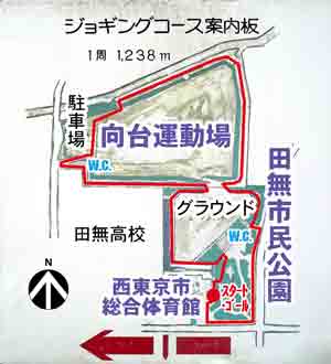 JUGEMテーマ:ジョギング 今回は西東京市、田無の 田無市民公園・向台運動場にあるジョギングコースです。 詳細データは以下のリンクから。 ( RUNTOP → 東京多摩 西東京市) ここではコース写真を紹介! コース案内図 公式にコースとなっているんですが、すっかり色があせてしまってルートが不明瞭です。 薄っすらと残る跡と1周1,238mという情報から予想してみました。 てか、まずこの案内板が公園の外側にある。 体育館との間の路地の...
