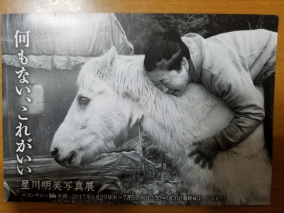 淡路島で一緒に海岸で外乗を楽しんだ滋賀の馬飼いさんに教えられて。 大阪ニコンサロンにて開催中。7月5日まで。 滋賀の自然の中でライフラインに頼らずに暮らす女性と馬と犬。 ポストカードをいただいた。 モンゴルでしか見ないようなゲルから顔を出す馬がかわいい。 今はいないというが山羊の写真もあったのでそれも。 山羊とは実現しているが、自然の中で馬やロバとも暮らしてみたいもの。 詳細はこちら http://www.ni...