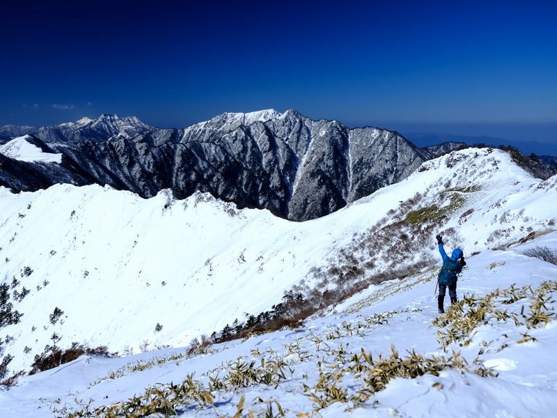 JUGEMテーマ:山行記録 四国の雪山で最も人気が高いエリアと言えば寒風・伊予富士。 さほど危険な場所もなく手軽。 三嶺と比較すると、体力的には半分以下で登ることができるところが魅力。 <伊予富士から石鎚山方面の展望> ■行先・位置 伊予富士(三等三角点 [伊予富士] 1756.2m) 高知県いの町・愛媛県西条市/北緯33度47分17秒・東経133度14分53秒 ■(*)コースタイム 寒風山登山口 8:14(12分)→ 1220m地点 8:26(アイゼン装着)/8:34(26分)→ ...