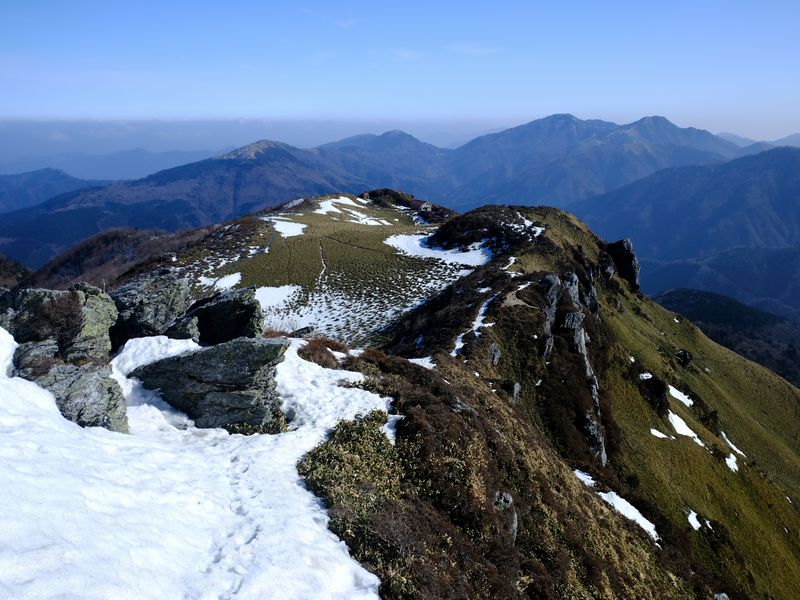 JUGEMテーマ:山行記録 四国山地の冬山登山での青空は貴重! 2018年の初三嶺は快晴の青空の下、冬の定番 カヤハゲコースで登ってカンカケ谷コースで下る反時計回りの周回で歩いてみた。 暖かい日が続いて雪がほとんど消えてしまったのが残念。 <三嶺> ■行先・位置 三嶺(二等三角点 [三嶺] 1893.6m) 高知県香美市・徳島県三好市/北緯33度50分22秒・東経133度59分16秒 ■(*)コースタイム 光石登山口 7:52(10分)→ 堂床分岐 8:02(31分)→ さおりが原 8:33(...