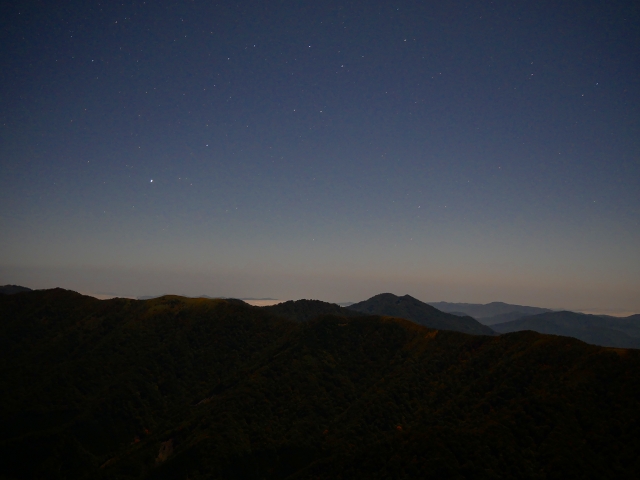 2017.10.08 三嶺〜剣山縦走の2日目です 夜半に目覚めたが、月明かりがあり、星影は写りませんでした 縦走路方面 剣山方向、見ノ越の明かりが見えます 三嶺山頂方面 朝食を食べ 小屋を出ると、明るくなっています 小屋を振りかえります 太陽が出てきました ...
