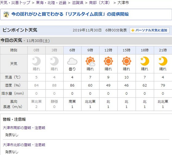 2019年11月30日(土曜日)。11月9日以来の琵琶湖でのセーリングです。今日で今年15回目の琵琶湖行です。2月、3月、7月、8月の4ヶ月は乗っていないので、私達夫婦のスケジュールからは、15回は良く行っている方です。 今朝の大津市の天気予報。 近江八幡市の天気予報。セーリングの目的地を沖島にすることが多いので、湖東の天気予報が役に立ちます。 今朝(7時6分)、志賀ヨットクラブのライブカメラで見た琵琶湖の様子。 琵琶湖の北東部では風がやや強く、午後には晴れ間が広がりそうですが、最高...
