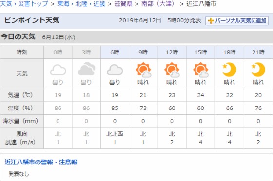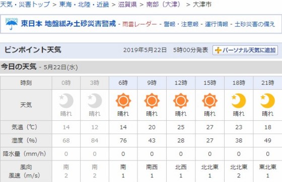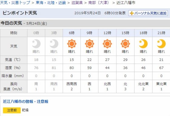 2019年5月24日(金曜日)。琵琶湖でのセーリング。一昨日に丸一日掛けて艇の大掃除をしたところです。その時、あまりに爽やかな風と快晴で、乗艇したくてウズウズしていました。それがあったので、急遽、一日置いて乗りに来ることになりました。 今朝の天気予報。近江八幡市の天気予報を参照するのは、セーリングで出かけるのに、近江八幡市に属する沖島を目指すことが多いからです。 最高気温29度の予報です。乾燥注意報は一昨日と同様です。湿度が低いと、風が爽やかで作業で汗ばんでも汗の乾きが早く気持ちが良...
