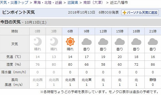 2018年10月17日(水曜日)。前回の琵琶湖でのセーリングは4日前(10月13日)だったのですが、ワイフのスケジュールも調整できてタイミング良く出かけることになりました。 13日はほとんど終日ベタ凪だったのですが、今日の天気予報を見ると、少しは風が良くなりそうな気配です。 近江八幡市の天気予報。 天気図。 いつもの通りJRで琵琶湖へ向かいます。 7時半に家を出て、JR塚口から乗車、尼崎で近江今津行の新快速に乗り換え、堅田で普通に乗り換えて、和邇駅に着いたのが9時18分。 農...