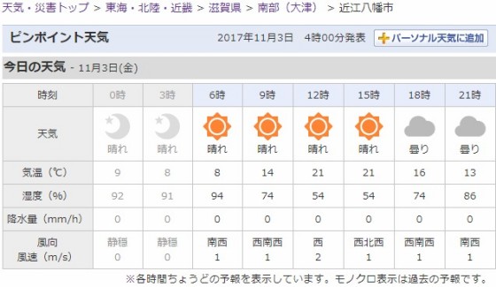 2017年11月3日(金曜日、文化の日)。台風21号の被害を受けた志賀ヨットクラブでは先週一杯は艇を出すことが出来ない状態が続き、そこにまた22号がやってきたりで強風対策を再び施すことになり、今週はじめにやっと平常の営業に戻ったところです。 今日は、天気は良さそうですが、日本海と太平洋に弱い低気圧があってその間に挟まれた日本列島の上空は微妙に弱い高気圧帯に入り、どう転ぶかわからない予測しにくい状態です。 それでも、予報士の皆さんは予報を出します。 今朝のYahoo!天気の、近江八幡市のピンポイント予報。...