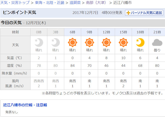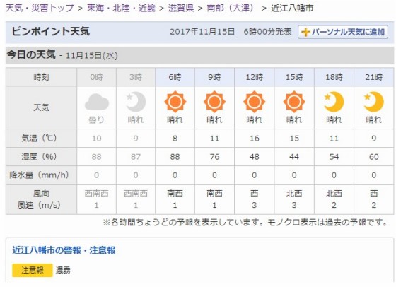 2017年11月15日(水曜日)。昨日の雨は、夜中には上がって朝から晴れの天気になりました。今日は琵琶湖へセーリングに出かけます。 今朝の天気予報(近江八幡市)。 志賀ヨットクラブは湖西にあるのですが、湖東の近江八幡市に属する沖島をセーリングの目的地にするために、湖東の天気予報を参考にしています。 志賀ヨットクラブのライブカメラで見た今朝7時の琵琶湖の様子。 濃霧注意報が出ていますが、これを見る限り今朝の湖と湖岸には影響がないようです。 何時もの通り、JRで琵琶湖へ...