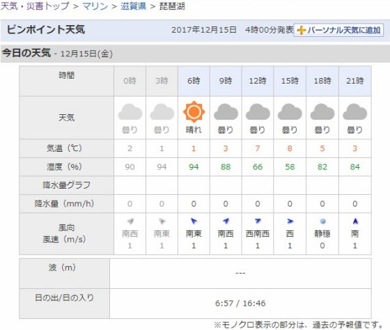 2017年12月15日(金曜日)。琵琶湖でセーリング。志賀ヨットクラブの今年最後の営業日は12月24日(日曜日)ですから、それまでに何とかもう1回はセーリングに出たいと願っていましたが、ワイフがスケジュール調整してくれて今日出かけることが出来ました。 天気予報(琵琶湖)。 今日のYahoo!天気のピンポイント天気では、琵琶湖周辺の各地、例えば大津市、守山市、野洲市、近江八幡市などの天気予報もほぼ似たようなものでした。 志賀ヨットクラブのライブカメラで見た琵琶湖の様子(7時2分)。 ...