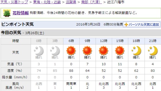 2016年3月26日(土曜日)。10日ぶりで琵琶湖へセーリングに出かけました。昨日にするか今日にするかか迷いましたが、一昨日の天気予報では、今日のほうが天気が良く多少気温も高そうだったので、それに従いました。気温10度以下で曇り空では寒さが堪えますから。 今日の天気予報(Yahoo!のピンポイント天気・近江八幡市)。 今日の午前6時50分の琵琶湖の様子(志賀ヨットクラブのライブカメラをキャプチャ)。 8時前に家を出てJRで尼崎へ。尼崎から近江今津行きの新快速で湖西線の堅田へ。堅田で普通に乗り換えてJR和邇駅着が...