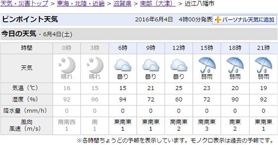 2016年6月4日(土曜日)。琵琶湖へセーリングに出かけました。 今朝の天気予報。Yahoo!の近江八幡市のピンポイント天気予報から拝借。 今朝(6時40分)の志賀ヨットクラブのライブカメラで見た琵琶湖の様子。 朝の琵琶湖は、まだ多少青空が残っているようですが、尼崎ではすでに完全な曇り空です。 何時もの通りJRで琵琶湖へ向かいます。自宅を8時前に出て(最近30分ほど出発を遅らせています。平日は朝のラッシュに合わないので。土曜日はガラガラですが。)、9時47分に湖西線和邇駅に到着。農道沿いを歩いて志賀ヨットクラ...