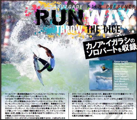 こんばんは SURF DVD人気タイトル【RUN WAY】の第2作!予約開始です!! ワールドツアー最終戦前最後のイベントとなるメオ・リップカール・プロはシーズン中もっとも盛り上がるイベントと言われている。 Tabrigade Film最新作『Runway 2 -Throw the dice-』は、ポルトガルのスーパーチューボスが開催地となるこのイベントをメインにフューチャーする。 ランキングトップのジョンジョン・フローレンスを筆頭に、常勝組のジュリアン・ウィルソン、ジョディ・スミス、連続優勝を狙う...