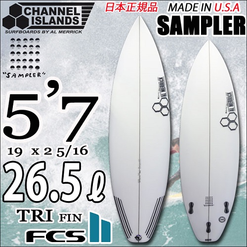 こんばんは CHANNEL ISLANDS [チャンネルアイランド]サーフボード アルメリック サーフボード 人気モデルのSAMPLER[サンプラー] 特に人気のサイズ5’7のFCS2プラグ仕様 ラスト1本となりました!! 5'7" x 19" x 2 5/16" (長さ:172.7cm 幅:48.3cm 厚み:5.9cm) ボリューム:26.7L メーカー希望小売価格 124,200円 (税込) 商品ページはこちら 特別価格中です アルメリック Sampler(サンプラー)はヒザ〜アタマのサイズでは恐らくアルメリック...