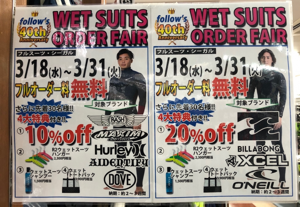 JUGEMテーマ:サーフィン follow'sはお陰様で開店40周年を迎えることができました!! ひとえにオープンから今日まで ご来店くださいましたお客様の暖かいご愛顧、ご支援のおかげです。 ありがとう御座います。 そこで、この度の感謝を込めて 40周年記念【第一弾】 としまして ウェットスーツオーダーフェア を開催します♪ 【対象モデル】 フルスーツ、シーガル 【オーダーフェア5大特典】 1、オーダー料無料 2、ブラ...