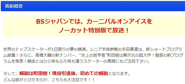 JUGEMテーマ:町田樹 町田樹 初解説まで あと3日!! 「カーニバル・オン・アイス 2017」の公式サイトには このような宣伝が。 なぜ赤字で太字www いったいまっちーはどんな解説をするでしょうね? 私は、意外とわかりやすい解説をしてくれると思っています。 私たちファンが期待しているような(笑)小難しい内容や、長々と彼ならではの表現で語るようなことはせず 万人が聞いてわかりやすく、それでいてちょっと目からウロコな...