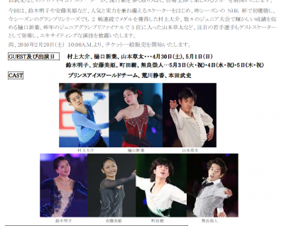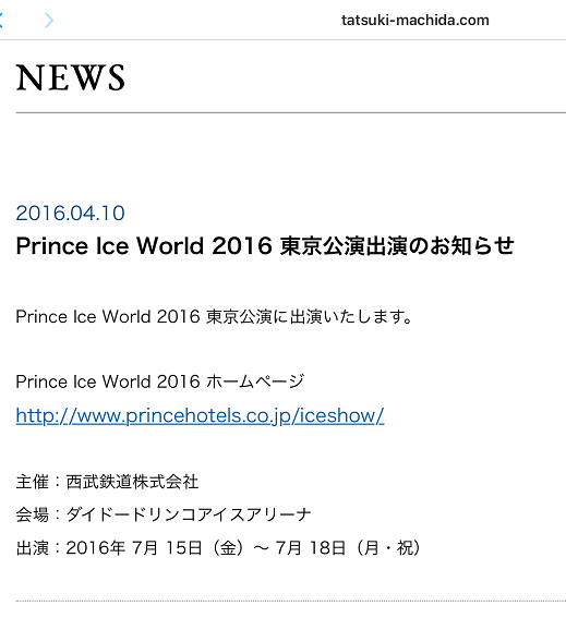 JUGEMテーマ:町田樹 まっちー、公式サイト更新来ました!!! http://tatsuki-machida.com/index.html 2016.02.17 Prince Ice World 2016 横浜公演出演のお知らせ Prince Ice World 2016 横浜公演に出演いたします。 Prince Ice World 2016 ホームページ http://www.princehotels.co.jp/iceshow/ 主催:テレビ神奈川 / 株式会社プリンスホテル 会場:新横浜スケートセンター 町田樹出演: 5月 3日(火・祝)〜 5月 5日(木・祝)6公演のみ 相変わらずそっけないですね(笑) 「6公演の...