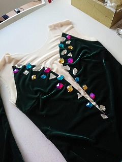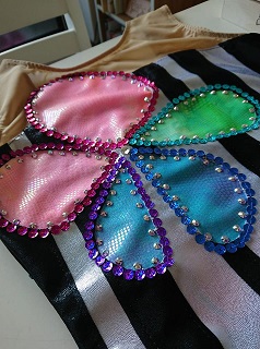 飾り付けはお母さまがされるのですが 大きなミラーストーンの配置を考えてほしいとご依頼がありました。 適当よ! と置いてみて 色と形のバランスを見ながら入れ替えていく。 前後の画像を送信して 前用、後用の一人分を袋に詰めて発送しました。 ミラーストーンではなく布を散りばめて 真似っこして既製レオタードを作ろうかと思います。 JUGEMテーマ:レオタード
