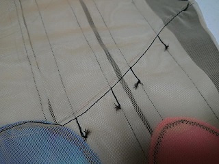 パワーネットとの切替部分はストライプの迫力そのまま ジグザグをかけたくなかったので ほどけないように端に返し縫をしました。 花の縁取りはスパンを付けない方が小粋だけど じっとしているわけではないので くっきりはっきりさせるためにスパンを付けることにしました。 ビーズ止めだと重くて野暮ったいので 糸止め なかなか時間がとれなくて焦っているのか 糸がもつれてばかり やっとここまでできました。 同じ青の花びらでも紫のスパンと青の...