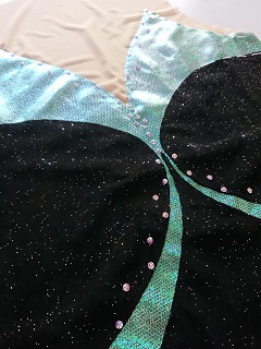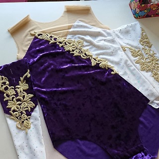 スパンを付け終わってレオタードに仕立てました。 一ヶ所違うところがあります、どこでしょう。 左の大きな花に紫のスパンではなく青のスパンが付いています。 そちらの方が私は好みなのですが 小さい画像で見ると大差はありません。 やはり紫に変えます。 予算の関係もあってラインストーンをどうするか。 花の中心部だけ付けるか。 大会などでの傾向を見ていると スパンの内側にラインストーンを並べてもいいと思うのですが 指導者の方の好みもあるでしょうか...