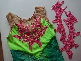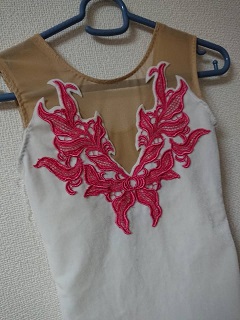 ピンクのレースはチューリップの花の付いた襟レースでした。 花を取り除いてピンクに染め 花は赤に染めました。 白のベロアが余っているからこれで1着作ろう。 布の上にいきなり並べてみましたが、無茶でした。 型紙の上に並べて、葉っぱを描いてみて 緑の布を目分量でその形に切って 水色も入れてみました。 いい感じ! 10年以上前に余り布で同じようなチューリップのレオタードを作りました。 さて今回...