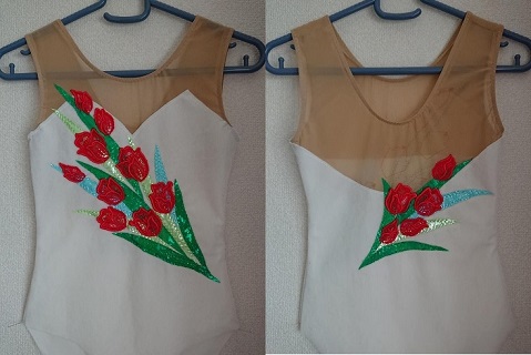できました。 葉っぱの縫い付けはジグザグにしました。 おかげで凹凸ができてキラキラします。 チューリップの花がもう1着分あります。 こちらはサイズオーダーとしてショップにだします。 デザインはそのまま ご希望のサイズでお仕立てします。 花の大きさは変えられないので、小さいサイズ向けです。 JUGEMテーマ:レオタード