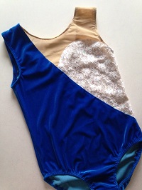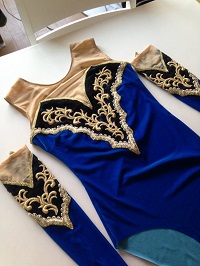 バトンのダンス衣装ですが 形としては基本の新体操用スカート付きレオタードです。 ラメの粒が貼り付けられた布は広げただけで粒が大量に落ちます。 扱う前にベランダで振り落としました。 それでも部屋中キラキラです。 パワーネットとの切替にはレース地の端を使います。 レースの下の端は模様に沿ってジグザグにするつもりです。 胸と背中では、布端の位置が違うので 脇での繋がりをどうするか 模様を気にしないで適当にジグザグにしてもわかりませんよね。 でも...