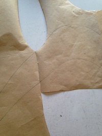 レオタードの型紙が用意できたら そこに作りたいデザインを描けば、作るための型紙ができます。 脇で前後がつながっていてほしいので 型紙をつなげて置いて線を描きます。 基本は土台となる布にアップリケをしていく要領です。 布をつなぐ(切り替える)場合は 重なる部分が必要なので下になる部分に線より余分な布をつけて裁断 上になる方は線の通り裁断して重ねます。 ロックミシンなら線の通り縫い合わせるだけですね。 私は布をつなぐ場合もパーツごとに...