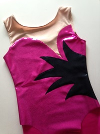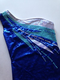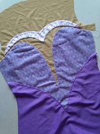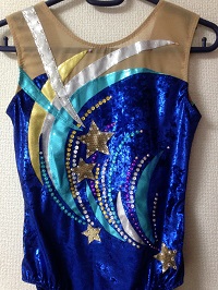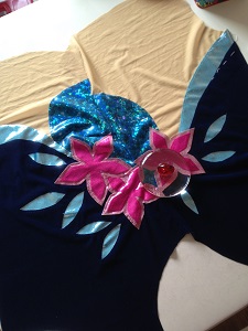 前の日にどこまでしていたのかなあ 青系ラメプリント2種類を配置したところまでだったと思うので 花のモチーフつけ、スパン付け、レオタードにお仕立て を1日で仕上げて発送することになりました。 偶然が重なりました。 いつもベロアのところのミシン掛けでずれて 脇のところを合わせるのが大変なので 花は別々に作って調整できるようにしていたこと 葉っぱの向きや形が型紙ではなかなか決まらなくて 花を付け終わってからバランスを見て直接布に描くことが多かったのです...