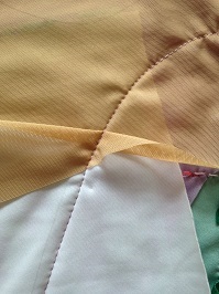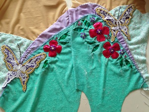 切替のところで、きれいにミシンをかけたと思ったら パワーネットを切っても大丈夫なのところなのでほどかずに パワーネットをカット 気をつけて後身頃・・・またするかな! これはしてよかった。少しずれているのでほどいて縫い直し 花の周りはビーズなしでスパンをつけてみたけど 中央の穴が気になるので、ビーズ付けに変更 蝶々のレースはそのままだとラメプリントの花や葉っぱに負けるので 下にラメプリントを重ねることに ゴールドで紫スパン?紫でゴールドスパン? 紫でゴールドスパンにして ...