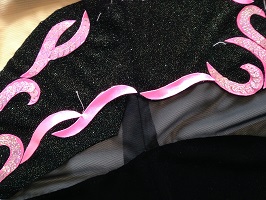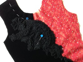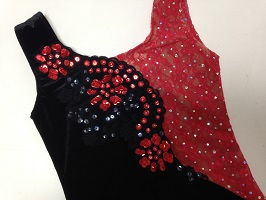 本番の早い順にお仕立していくとすると チームの方のが最優先です。 黒と赤の切替の黒側に黒のレース 赤のスパンを付けます。 一日で仕上げて明日持って行きたかったのに、赤スパンがない! メタリックの6ミリはあるけど8ミリが要る ホログラムはどちらもない! 赤黒を逆にして、赤ベロアに黒レース、黒レース地、赤スパン いけるかな?バランスが悪いかな? 画像を見ると下の花の位置がおかしい なぜかボンドで貼らなかったので、修正します。 JUGEMテーマ:レオタード
