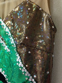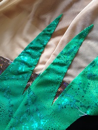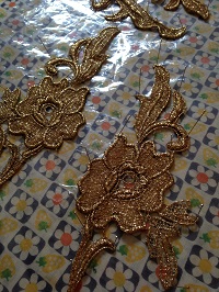 整形し直したレースは花の部分は戻りましたが その他は戻りませんでした。 速乾の接着剤で丁寧に貼って、ミシン掛けでさらに押えました。 きっと私にたくさん触ってほしかったのでしょう。 おはりこの最初のお客さま、これで何着目でしょう。 これをお召しになるお子さんがお生まれになった年に 上のお姉さまのペアの衣装をお仕立てしたのが遠方の方にお仕立てした最初のレオタードです。 光物をお母さまが付けられます。 髪飾りです。 JUGEMテーマ:レオタード