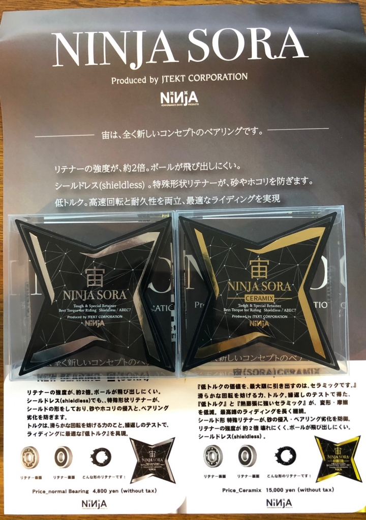 JUGEMテーマ:スケボー いよいよゴールデンウィークスタート!! 話を聞いていると10連休の方多いようですね うらやましい・・・ 連休中、フォローズ岐阜店にてお待ちしております♪ 4月30日、火曜日は定休日ですのでご注意ください。 今回ご紹介するのは スケーターなら誰もが知っている ベアリングブランド NINJA(ニンジャ)ベアリング からNEWモデル登場!! NINJA SORA (宙) 高速回転と耐久性を両立!! シ...