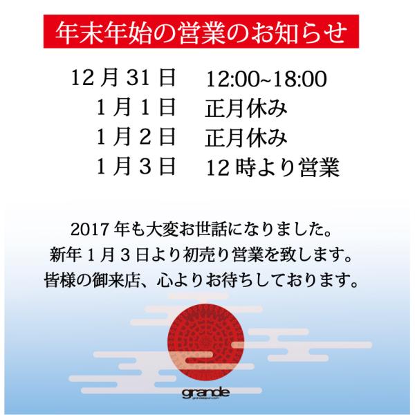 JUGEMテーマ:スケボー 年末年始の営業のお知らせです。 本日は、たぶん18時まで営業してると思います。 仕事が終わらなさそうなので、20時までかも知れません。。。 1日(月曜日)、2日(火曜日)はお休み。 初売りは3日(水曜日)からです。 どうぞよろしくお願いします。 2017年も残すところ数時間で終わります。 年末も多くのスケーターやお客様で賑わってました! いつものメンツが集まりスケート納めに行き、 子連れで来たり、 東京にカブれてパン...