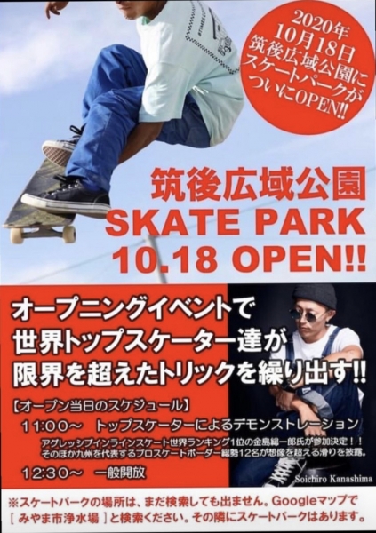 JUGEMテーマ:スケボー 10月18日(日曜日)に筑後後期公園内のスケートパークがオープンします! 当日は11:00からスケートのデモ、12:00からフリー滑走となります。 当日はヘルメット着用で16:00までの滑走となります。 楽しみです!! 皆さん、是非ご参加ください♪