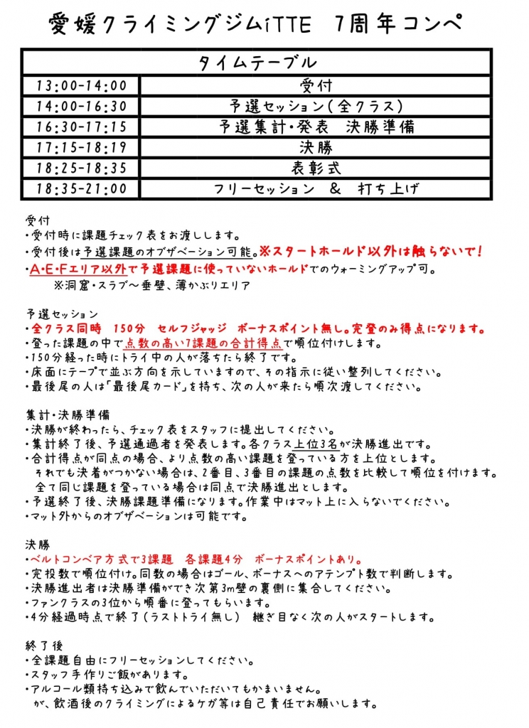 JUGEMテーマ:クライミング こんにちわ!! いよいよ今週末 iTTE 7周年コンペ 開催です!! その準備にともないまして、前日の2月17日は臨時休業とさせていただきますので お間違いのないようによろしくお願いいたしますm(^∸^)m そしてコンペ当日も一般のお客様にはご利用いただけなくなっておりますので 併せてお願いいたします。 かなりの人数の方にご参加いただきますので 下記のタイムテーブルやお車の乗り合わせなどご協力いただくことが多々あると思いま...