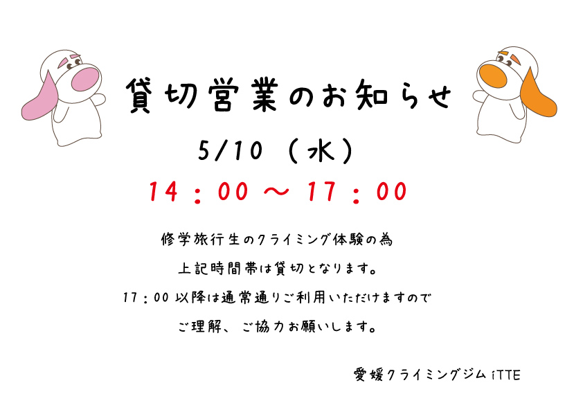 JUGEMテーマ:クライミング こんにちは!! GWも終わり、今日は待っていてくれたかのように雨ですね〜 楽しんだ方も、お仕事だった方もお疲れ様でした!! さて、明日は中学校の修学旅行でボルダリングをするという素敵な企画で14時から17時まで貸切営業となりますのでご来店を予定されている方はお時間をずらしてお越しください