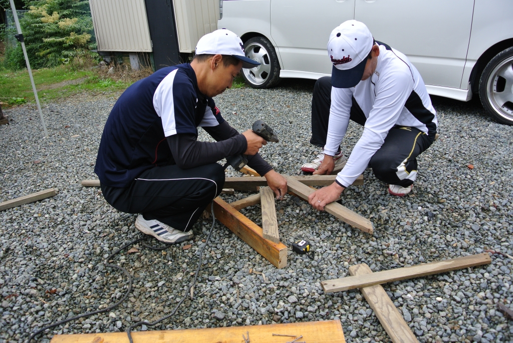 JUGEMテーマ:野球 youパパです。 本日は雨で待機の後、練習開始です。 しかし、寒いです。めちゃくちゃ寒いです。 父たちも3人しかいません。 雨の中、選手たちは練習、父たちはトンボの修理をしました。 どうですか。この二年学代 T尾パパの活躍!手に持っているのはではないですよ。 その辺の、木端を使って、Y村パパの丸ノコさばきも冴えわたり 完成です。 途中、本日の炊き出しが気になって見に行きました。 母小屋で仕込みの真っ最中で...