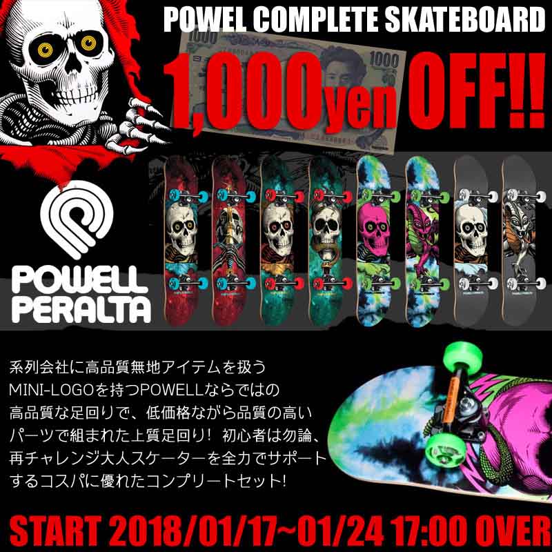 JUGEMテーマ:Skate board ハイサイ! さー今週もやって来ました マジ卍セール! じゃなくて、、 1週間限定セール情報です! 今週はこちら↓↓ まじっすか!!! まさかの、、 POWELL パウエル(コンプリート) 1000円オフ!!! 今回は大人スケーター 胸熱企画なのではないでしょうか!? ↓↓↓ ■1週間セール...