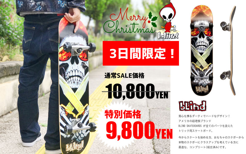JUGEMテーマ:Skate board ハイサイ! 毎週金曜日は、限定セール情報をお届け! 今週は、、 ギリギリの告知になってすみません! 3日間限定セールを 2つお知らせします! まずはこちら↓↓ 超老舗ブランド 「bLind」のコンプリートデッキが 通常10,800円のところ 特別価格9,800円で販売中! 「bLindってどんなブランドなの?」 って方に簡単にご紹介...