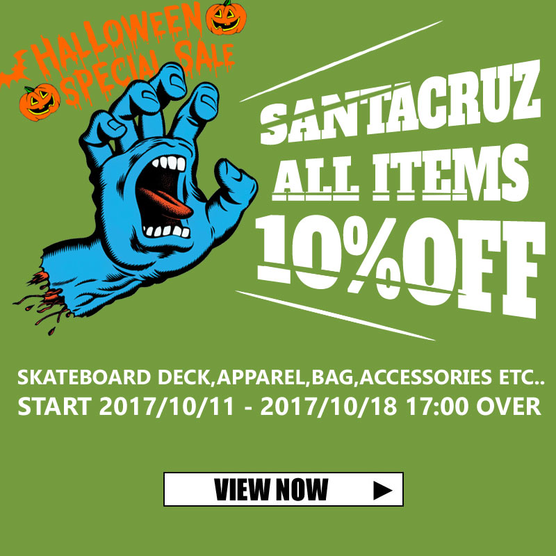 JUGEMテーマ:Skate board ハイサーイ! お待たせしました、毎週金曜日恒例! スケートボードショップ砂辺のセール情報で〜す! 今週は、、 ハロウィーンスペシャルセール!SANTACRUZ全品10%off!! サンタファンの皆さん、ついにやってまいりました! デッキも、ソックスも、ジャケットも、ステッカーもSANTACRUZ商品全品10%OFF!! 関東の方だともうそろそろ肌寒くなってきたでしょ? 「上からもう1枚、手軽...