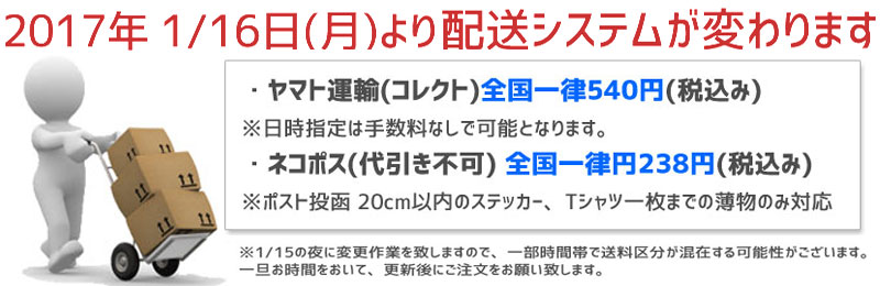 2015年秋より試験運用させて頂いておりました「おまかせ配送(送料無料)」ですが、 定形外郵便の遅延や追跡番番号の無いご不安、日時指定が出来ないご不便など頂きましたお客様のお声を考慮させて頂き、 2017/1/15を以て廃止させて頂く運びとなりました。 これにより配送料金に改定がございます。 ・ヤマト運輸(コレクト)全国一律540円(税込み) ※日時指定は手数料なしで可能となります。 ネコポス(代引き不可) 全国一律円238円(税込み) ※ポスト投函 20cm以内のステッカー、Tシャツ一枚までの薄物...