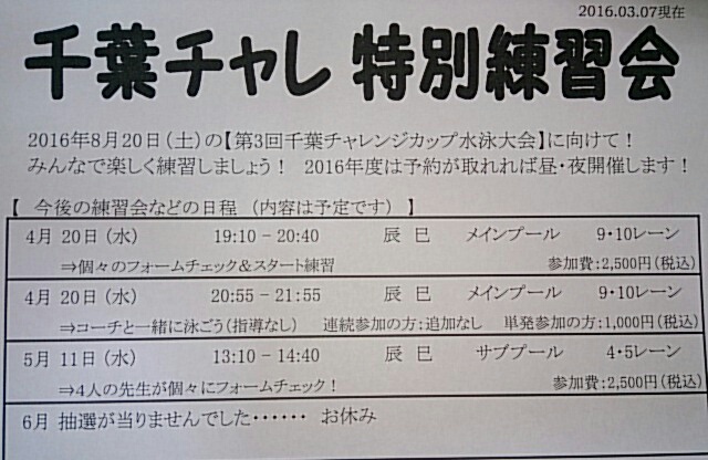 JUGEMテーマ:水泳 お知らせ 今までの「千葉チャレブログ」が 書き込みも見ることも出来ない状況です。 4月20日の練習会 は予定通り行いますので ご安心ください(^^) ↓ 前回のブログを載せておきます 2016年度も「千葉チャレ特別練習会」を開催致します(^^) まずは 4月の夜 と 5月のお昼 。 先着24名様までとさせていただきます。 お申込みフォームをご用意致しました。 こちらからのお申込みが便利です! ↓ **...