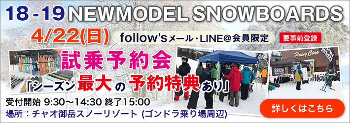 JUGEMテーマ:スノーボード 4月22日(日) follow'sメール、LINE会員様限定 試乗予約会 inチャオ御岳スノーリゾート にて開催致します。 当初の予定より変更点がありますのでご連絡です。 雪の状況で開催が危ぶまれましたが 開催致します 変更点、お詫びがありますのでご確認ください。 ☆受付開始時間 8時半からの受付開始、9時からの貸し出し開始 とします。 ☆当日受付(当日スノーボードのご予約をされる方のみ) デジエントリーが間...