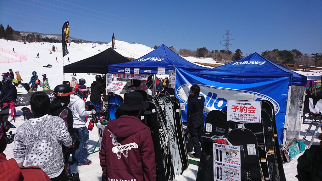 JUGEMテーマ:スノーボード 本日は晴天の中 高須スノーパークにて 東海地区プロショップ合同試乗会が開催されました!! 大勢のお客様にご来場頂きました! 有難う御座います♪ フォローズブースでは RICE28(ライス28)スノーボード 011Artistic(ゼロワンワン)スノーボード BCstream(ビーシーストリーム)スノーボード を貸出 人気ブランドでにぎわいました! OPEN直前 隣のブースは November(ノベンバー)スノーボード ...