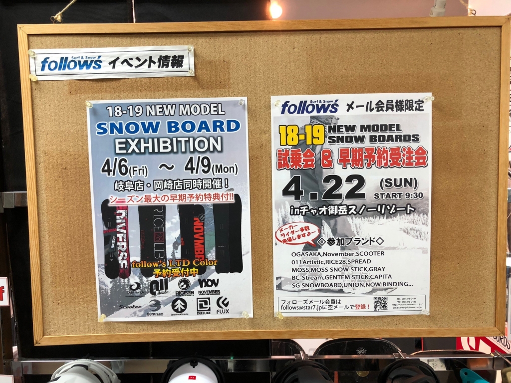 こんばんは 4月も始まり 新年度がスタート 気持ちを切り替えて 店内のレイアウトを大幅に変えて 今までより商品数が多く並んでいると思います!! 【4月のイベント情報】 4月6日(金)〜4月9日(月) 展示予約会を開催します!! 18-19 NEWMODEL SNOWBOARDS EXHIBITION すでにRICE28(ライス28)スノーボードは本ちゃんが入荷済み 期間中は RICE28(ライス28)スノーボード NOVEMBER(ノベンバー)スノーボード ...