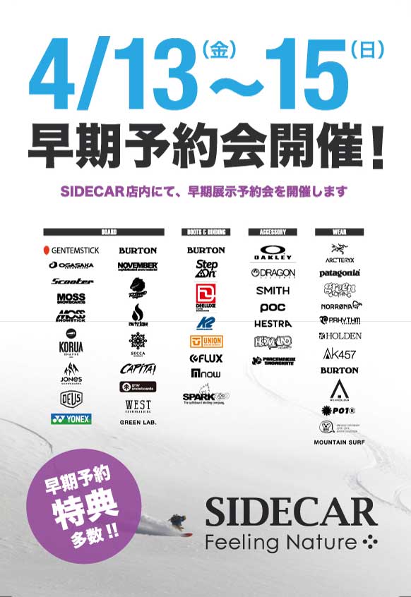 高鷲スノーパークでの試乗会、2日間天候に恵まれ本当に多くの方々に参加して頂きありがとうございました。 例年にも増して数多くのメーカーさんにも参加いただき、開催場所も大幅に拡大して2日間大盛況でした。 ご協力頂きましたメーカーさん、そして会場を提供して頂いた高鷲スノーパークさんにも本当に感謝です。 そして次は展示会をサイドカー店頭で開催します。 4月13日(金)〜16日(月)で開催しますが、一部のブランドは15日までサンプルを返却してしま...