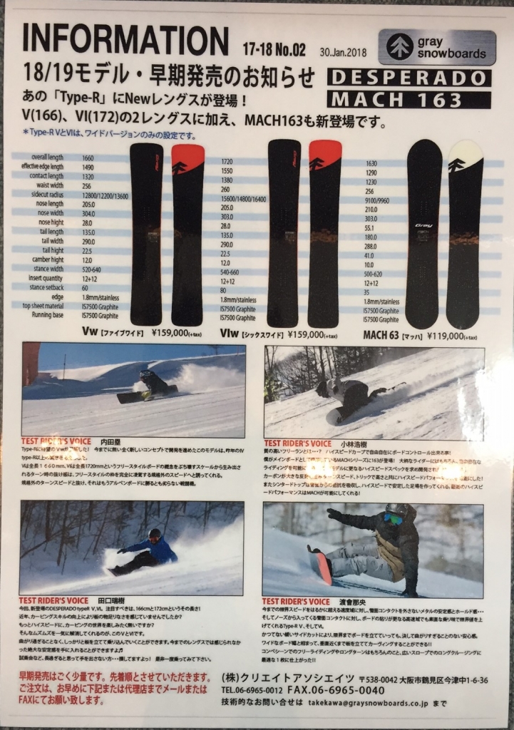JUGEMテーマ:スノーボード 来週は月曜日から雨予報です・・・ もうゲレンデも雨が降る季節ですね あまり雪が減らないように願っています。 シーズンはまだまだ続きますが 18-19モデルのアーリーモデルが入荷しました♪ GRAY(グレイ)スノーボード 3モデル 商品ラインナップはこちら DESPERADO Ti Type-R からはロングサイズが2サイズ Vw(166cm) / VIw(172cm)の登場です。 画像は172? ...