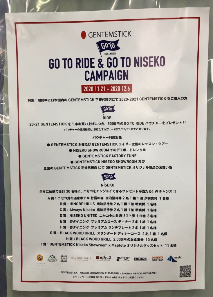 JUGEMテーマ:スノーボード 岐阜県奥美濃のゲレンデも続々OPEN!! 連休に初滑りの方も多いのではないでしょうか。 暖かい日が続きましたがここからの冷えこみに期待です! 今回はお得イベントのご紹介!! 大人気のパウダースノーボードブランド GENTEM STICK ゲンテンスティック 商品一覧はこちら から GO TO RIDE & GO TO NISEKO CAMPAIGN 11月21日〜12月6日まで!! 内容...