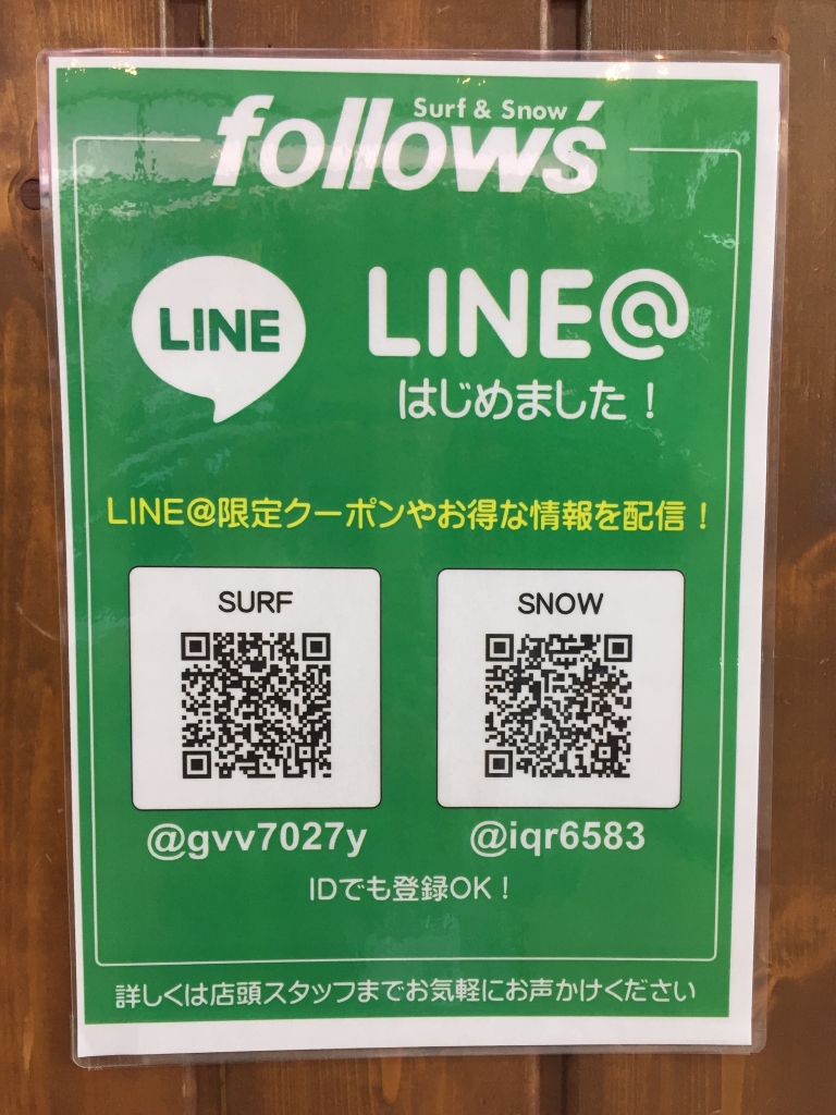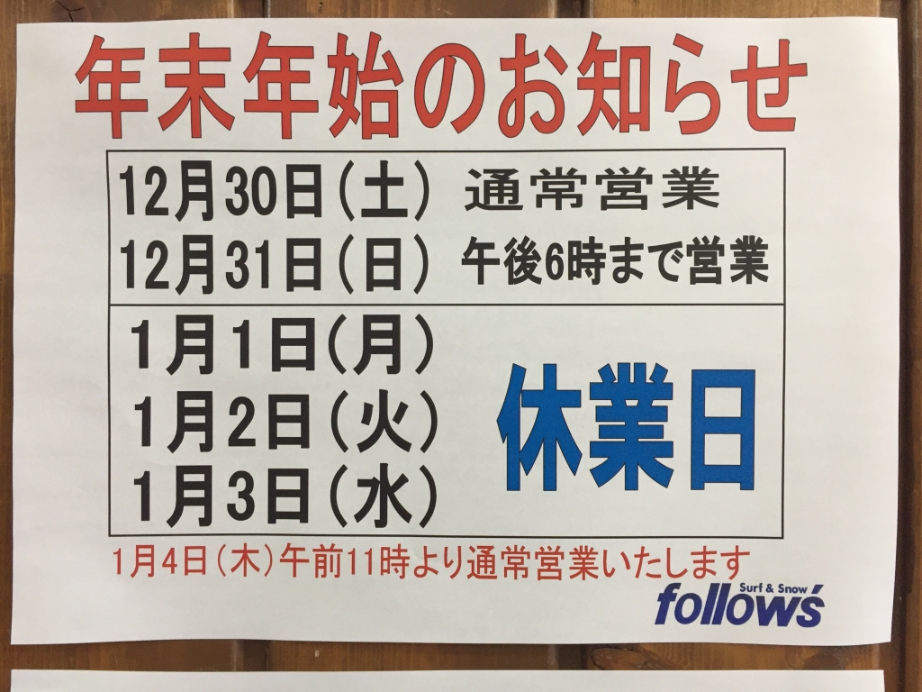 JUGEMテーマ:スノーボード 12月31日大晦日 今年も1年有難う御座いました!! フォローズ初売りは1月4日からです♪ 初売りSALEお楽しみに♪ フォローズLINE@はじめました♪ フォローズSNOW @iqr6583 フォローズSURF @gvv7027y こちらのIDで登録可能です。 よろしくお願いします♪ 初売りでは超お得 店頭のみお年玉クーポンを予定しています。 是非登録して初売りにご来店ください。...
